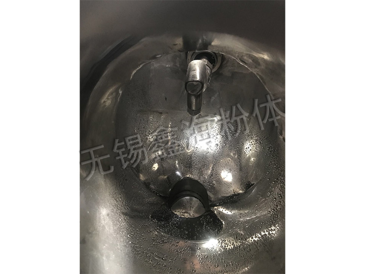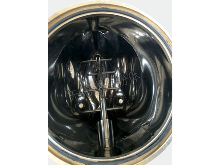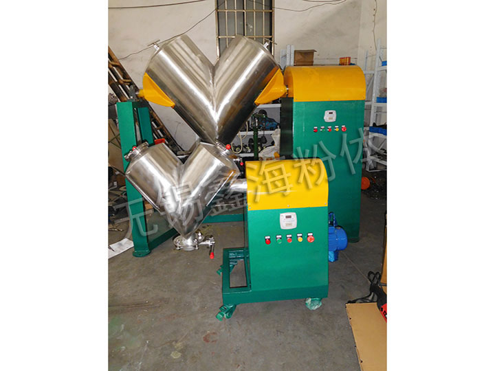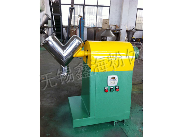 一端装有电机与减速机,电机功率通过皮带传给减速机,减速机再通过联国器传给V型桶。使V型桶连续在桶内上、下左右进行来回混合。