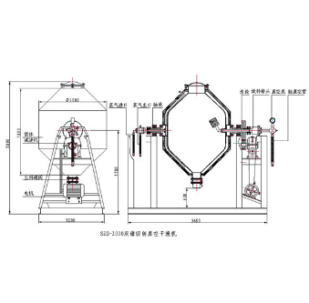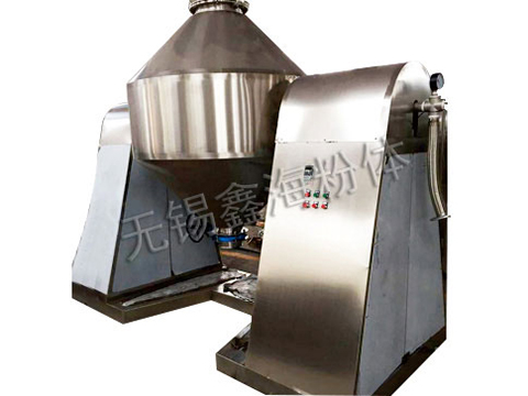 双锥回转真空干燥机为双锥形的回转罐体,罐内在真空状态下,向夹套内通入蒸汽或热水进行加热,热量通过罐体内壁与湿物料接触。湿物料吸热后蒸发的水汽。通过真空泵经真空排气管被抽走。由于罐体内处于真空状态,且罐体的回转使物料不断的上下,内外翻动,故加快了物料的干燥速度,提高干燥效率,达到均匀干燥的目的。